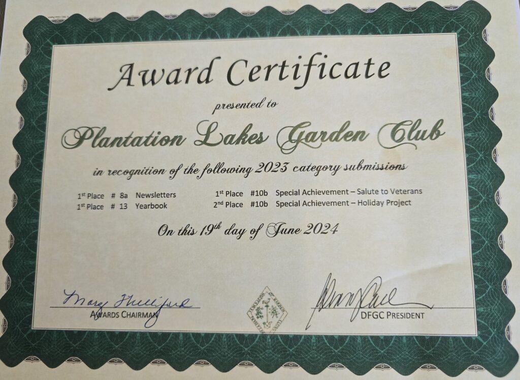 Plantation Lakes Gardeners periodically host local events that are open to the public and have the opportunity, through affiliation with other garden clubs, to participate in various local, regional or national activities.
